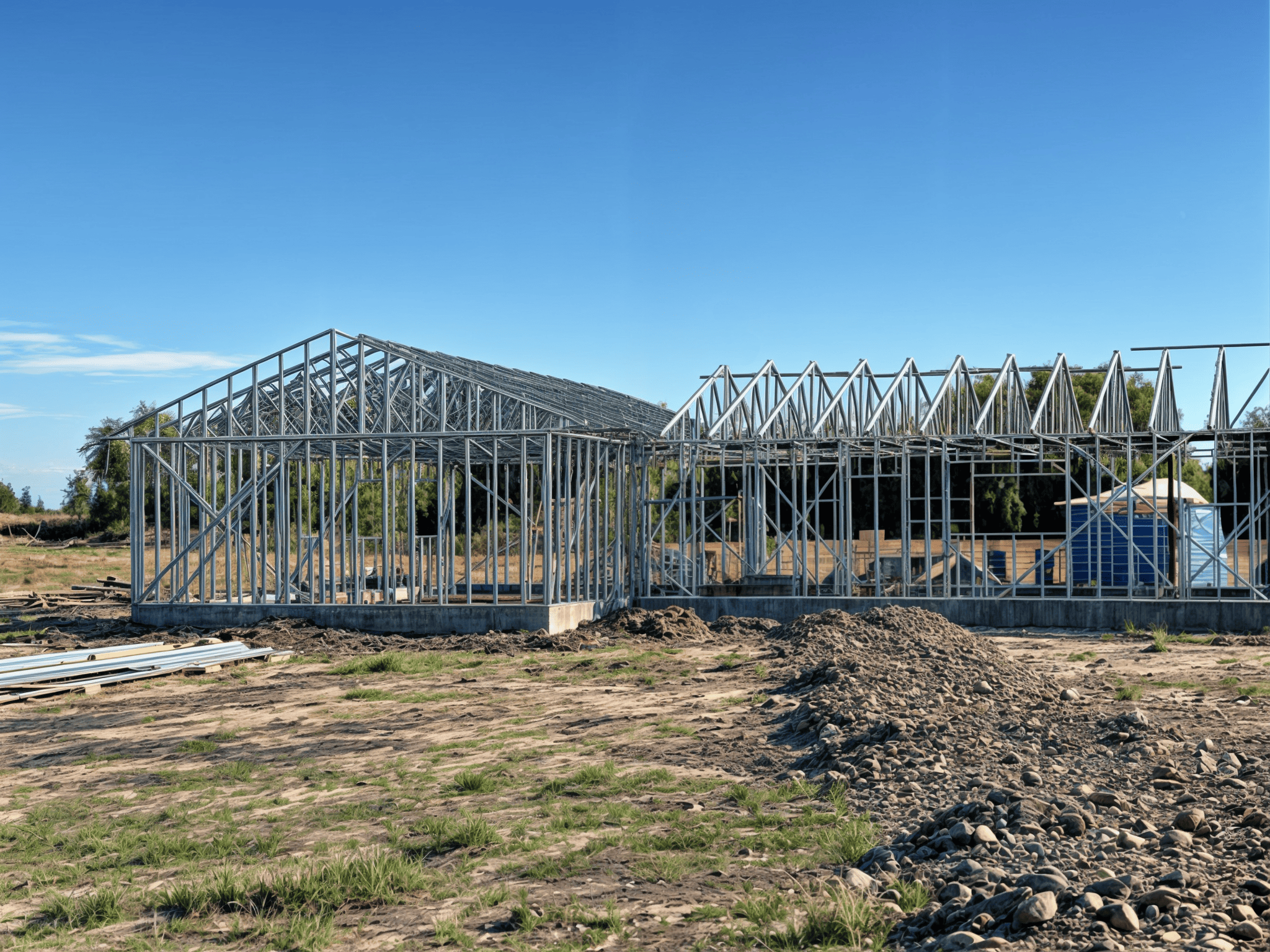 En términos de construcción se optó por una materialidad en base a perfiles Metalcon, esto con el objetivo de reducir los tiempos de construcción y ser un material muy versátil para trabajar.
