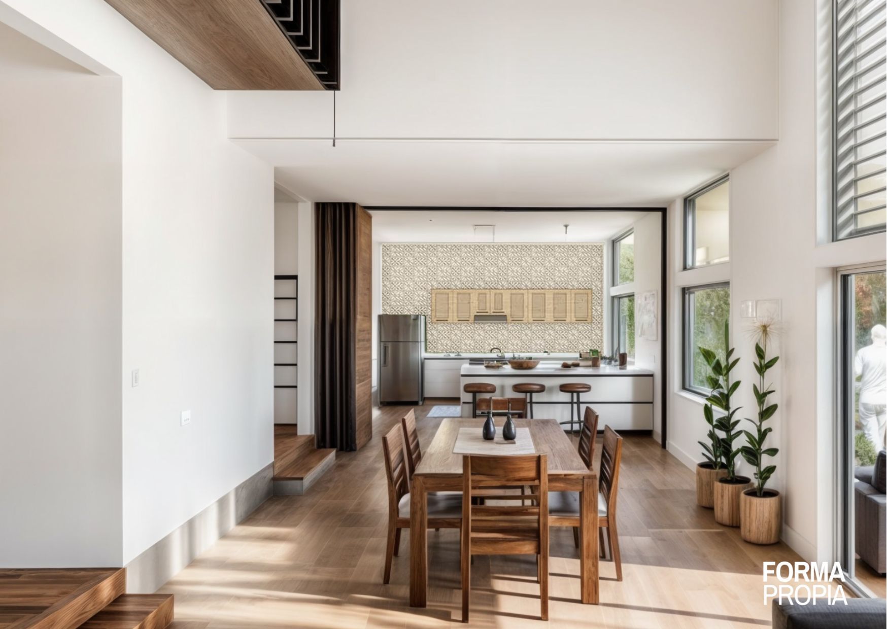 Se plantea la vivienda en base a un gran espacio para los recintos de uso público, con una planta lo mas libre posible donde desarrollar los programas de estar, comedor y cocina. A partir de este espacio se accede tanto a terraza como a habitaciones y recintos asociados de índole mucho mas privada.