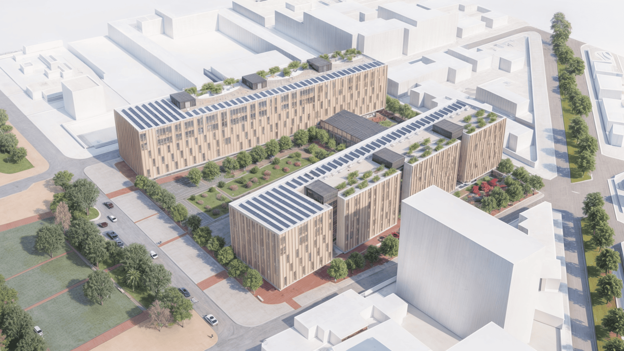 A los costados oriente y poniente del solar se levantan 2 volúmenes que concentran el programa público, municipal, comercial y residencial de la propuesta, conteniendo el espacio público central y proyectando las relaciones visuales hacia la Alameda. Los bloques se plantean con sistemas estructurales prefabricados, de hormigón armado y madera laminada, implementando sistemas y estrategias de optimización de recursos energéticos. Las circulaciones son consideradas como espacios amplios y versátiles, contemplando accesibilidad universal, permitiendo tanto la implementación de medidas de resguardo ante la emergencia sanitaria como la expresión espontánea y segura de actividades de carácter cívico y cultural.